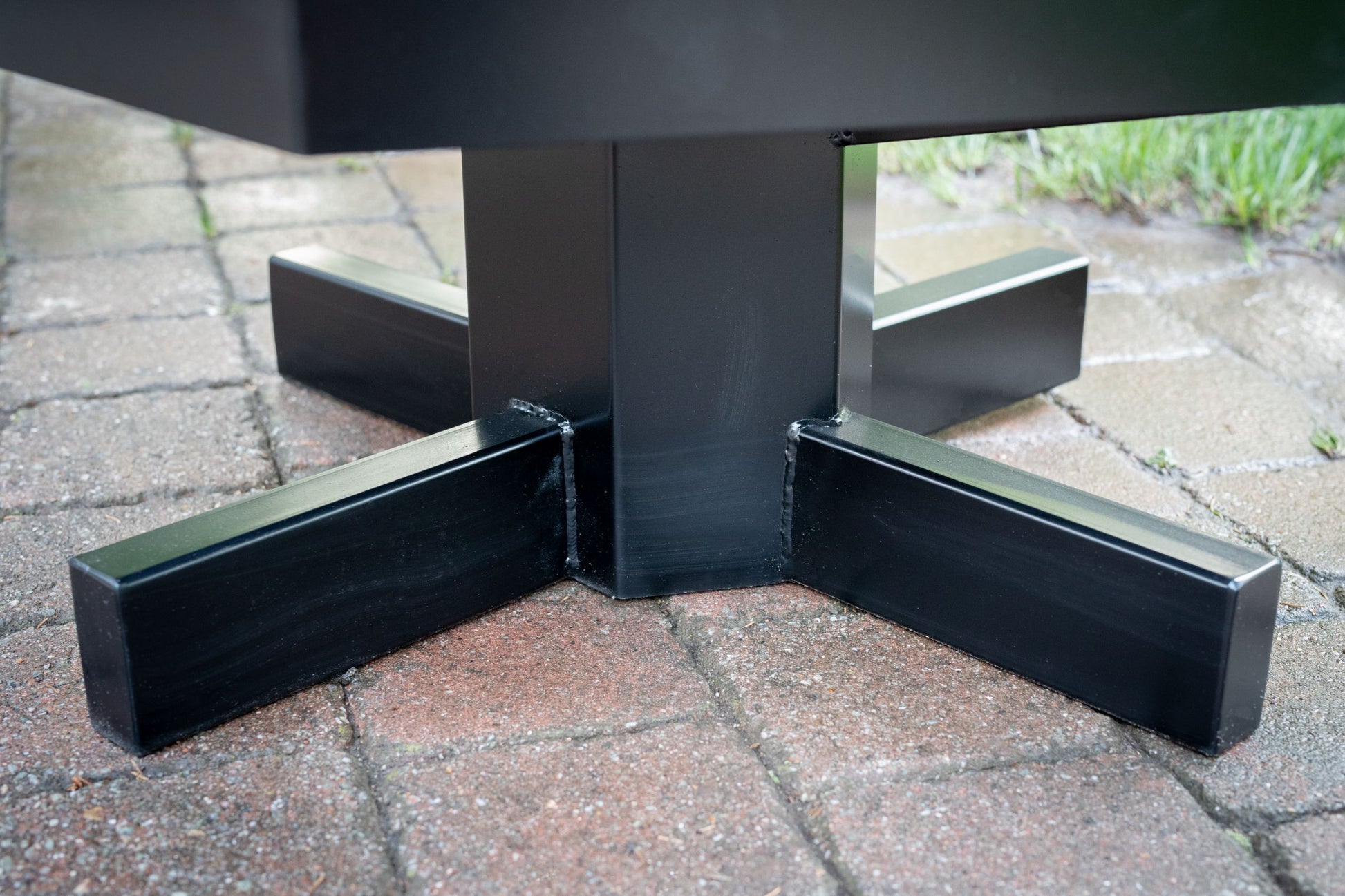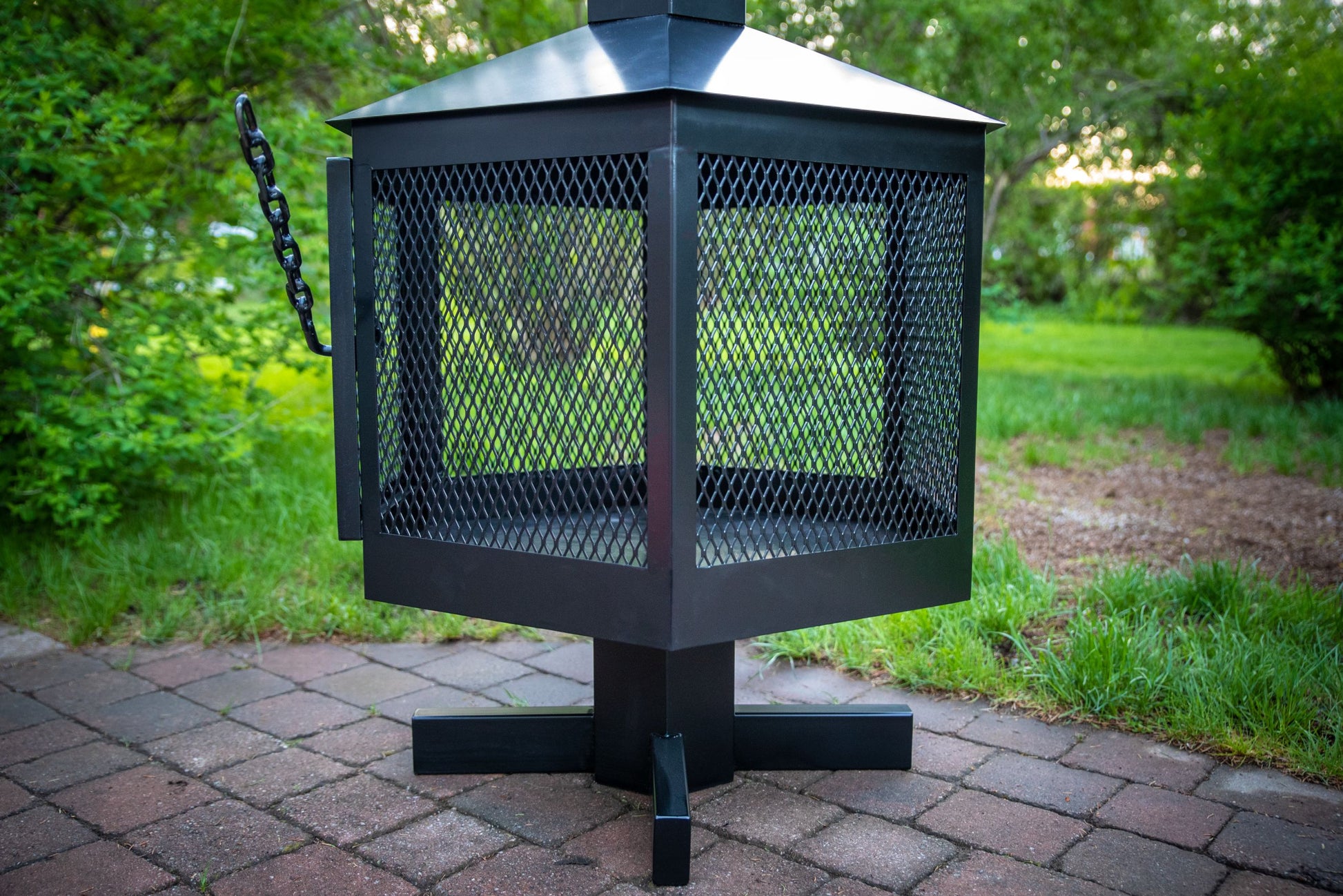 Our hand-crafted 7’ chiminea wood burning outdoor fireplace is one of the best ways to bring warmth, light, and style to an outdoor area. 135 pound all-steel construction coated with a powder coat technology oven baked paint to help delay weathering. It features a heavy duty cross base with a sturdy 1/8” hexagonal frame and the thickest available mesh on all sides for a clear view of the fire no matter where you're seated. Mesh chimney top reaching 7’ guides smoke out of the way and no embers will escape. The bulbous body which door opens with a front locking handle measures 33” x 29” x 25”H. Proudly designed and made in Quebec, Canada.