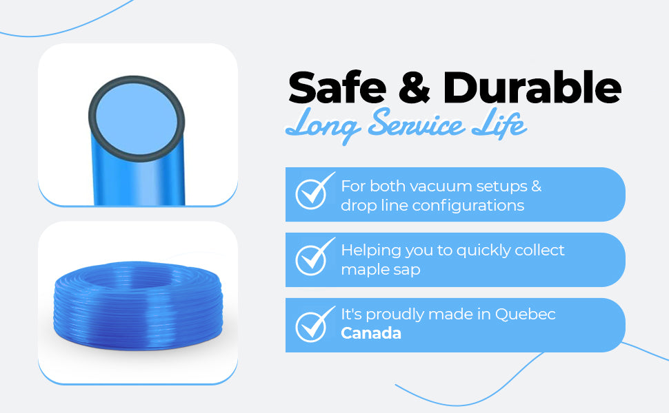 Eco-friendly and Practical: Not only is our tubing easy to clean and reuse, but it's also designed to fit 5/16" taps perfectly. Plus, it's proudly made in Quebec Canada, ensuring both quality and sustainability in its production. Make the responsible choice for your maple sugaring operation with our premium maple syrup tubing.