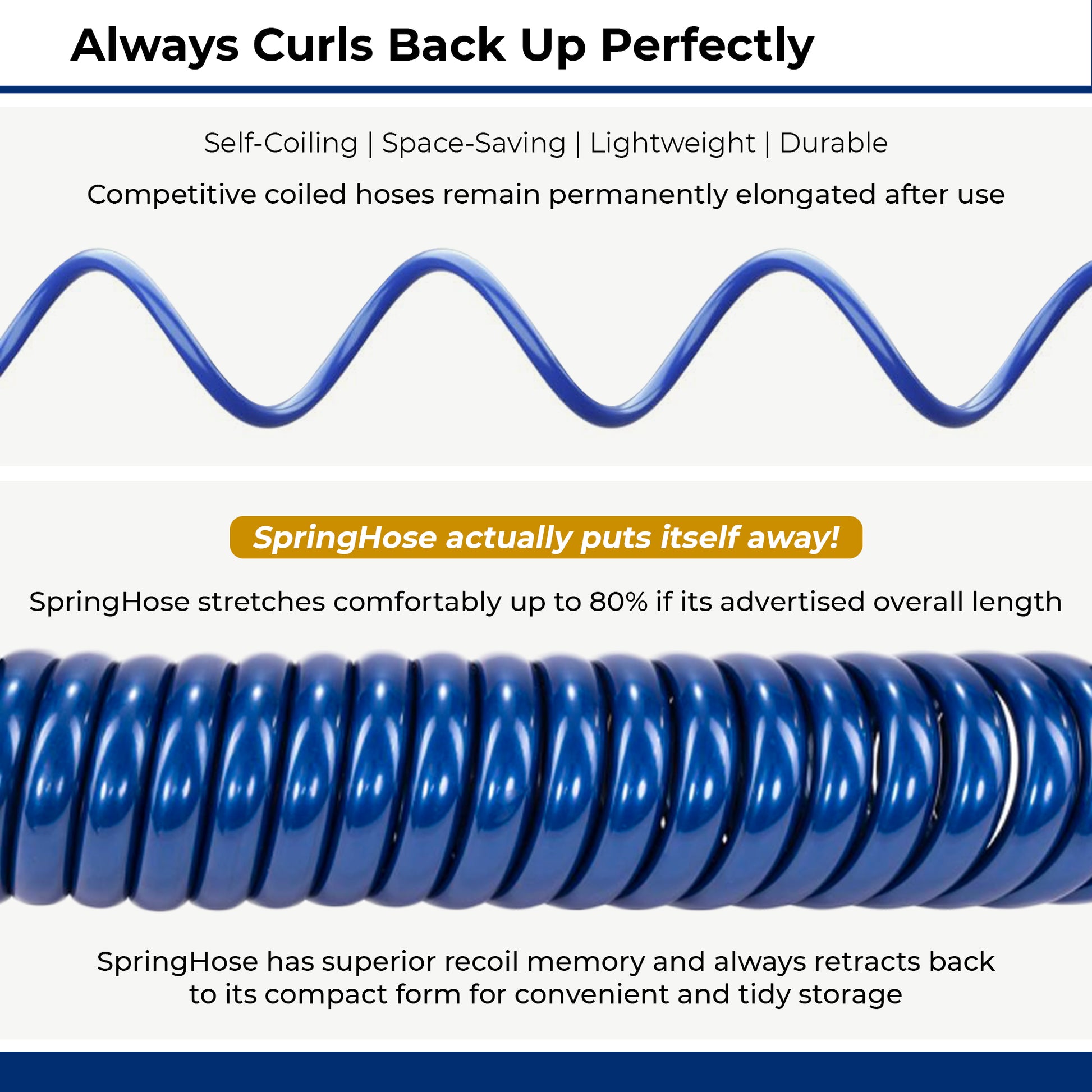 Space Saving Convenience: Unlike straight conventional hoses, SpringHose actually puts itself away! Its unique coiled design stretches to over 80% of its advertised length and effortlessly recoils to its compact length, saving valuable storage space.