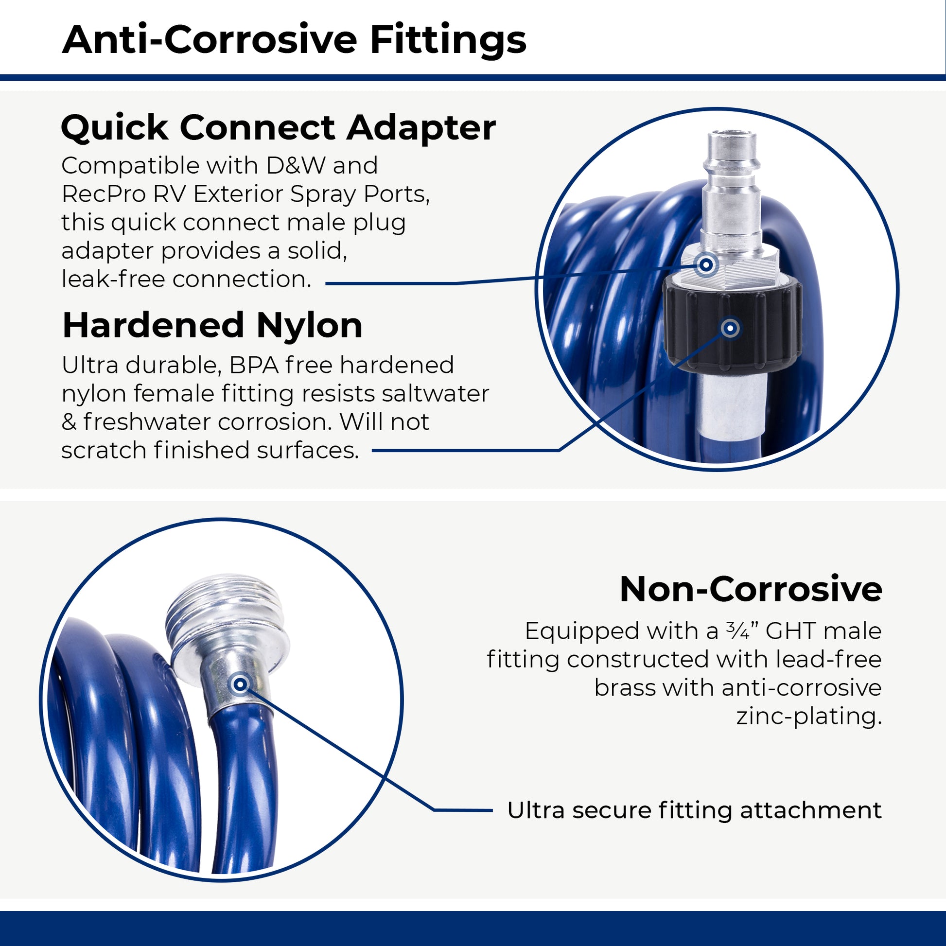 Quick Connect and Release: Equipped with 3/4” GHT male/female fittings on both ends and featuring a quick-connect male plug adapter designed for effortless and efficient connection between the hose and faucet. This quick connect adapter provides a solid, leak-free connection. Compatible with D&W and RecPro RV Exterior Spray Ports.